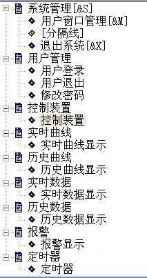 ·在MCGS嵌入版組態軟件的組態平臺上的“主控窗口” 中,按“菜單組態”按鈕打開菜單組態窗口。在“系統管理”下拉菜單下,單擊工具條中 “新增下拉菜單項” 圖標,增加8個菜單,分別為“控制裝置”、“定時器 窗口”、“實時曲線”、“歷史曲線”、“實時報表”、“歷 史報表”、“用戶管理”。再單擊“新增菜單項”圖標增加3個菜單,分別為“登錄系統”、“修改密碼”、 “退出系統”,如圖實訓5-29所示。