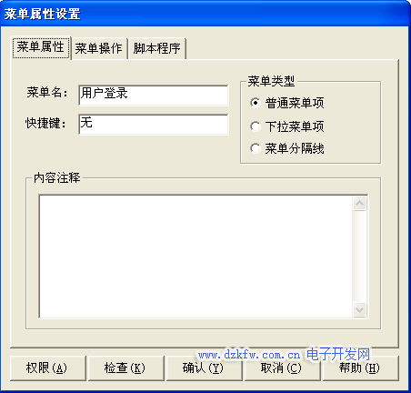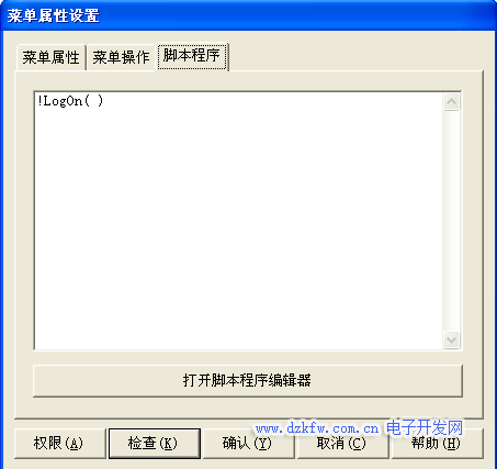 ·下拉菜單項連接相對應的窗口。其中“登錄系統”的屬性設置,進入“腳本程序”屬性頁,在程序框內輸入代碼!Log On(),具體操作如圖實訓5-30所示。