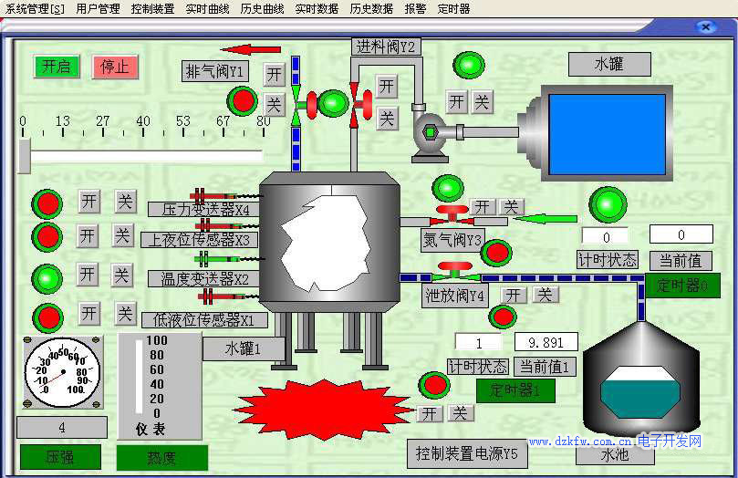 ·1.工廠設備:1個電機、1個鍋爐、1個水灌、1個水池、四個傳感器、四個閥。