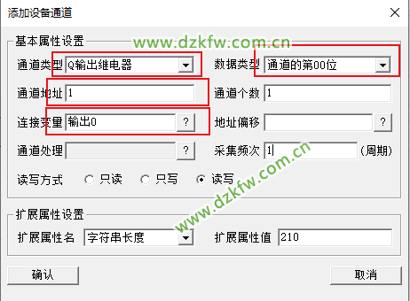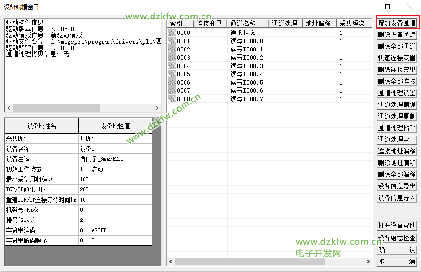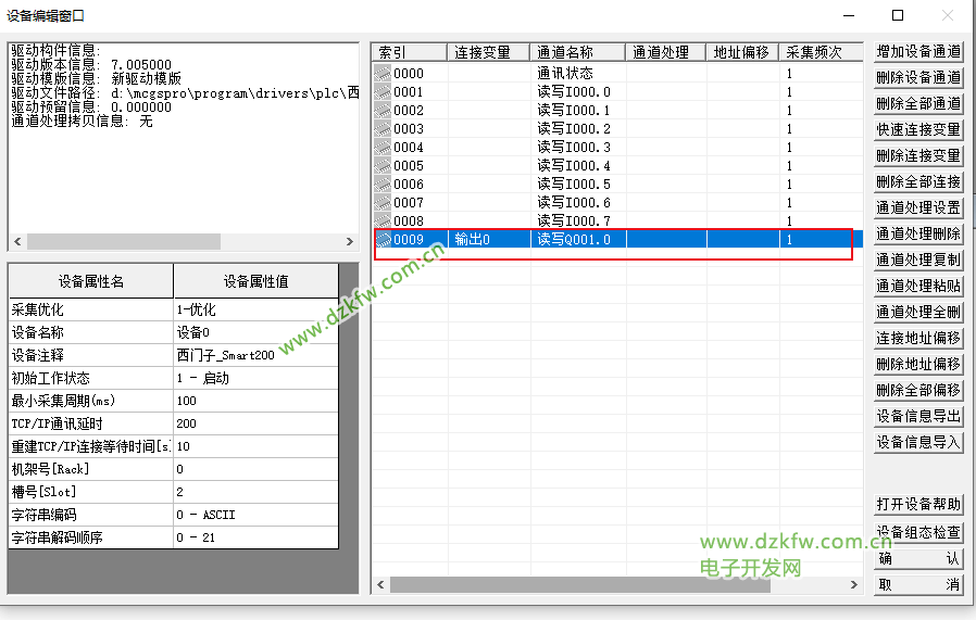 9.在設(shè)備編輯窗口中增加一個設(shè)備通道,對應(yīng)PLC的Q1.7,并和變量輸出0關(guān)聯(lián)起來。
