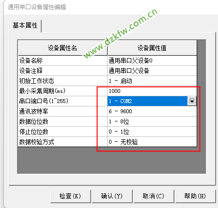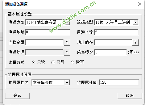 - 子設(shè)備參數(shù)配置,這里選擇的是ModbusRTU_串口,設(shè)備屬性保持默認(rèn)即可,主要是添加通道,關(guān)鍵配置點(diǎn)如圖所示:4區(qū)輸出寄存器,16位無符號(hào)二進(jìn)制,通道地址0,個(gè)數(shù)2,只讀。