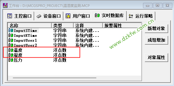 - 實(shí)時(shí)數(shù)據(jù)庫(kù)添加溫度、濕度對(duì)象,數(shù)據(jù)類型位浮點(diǎn)型