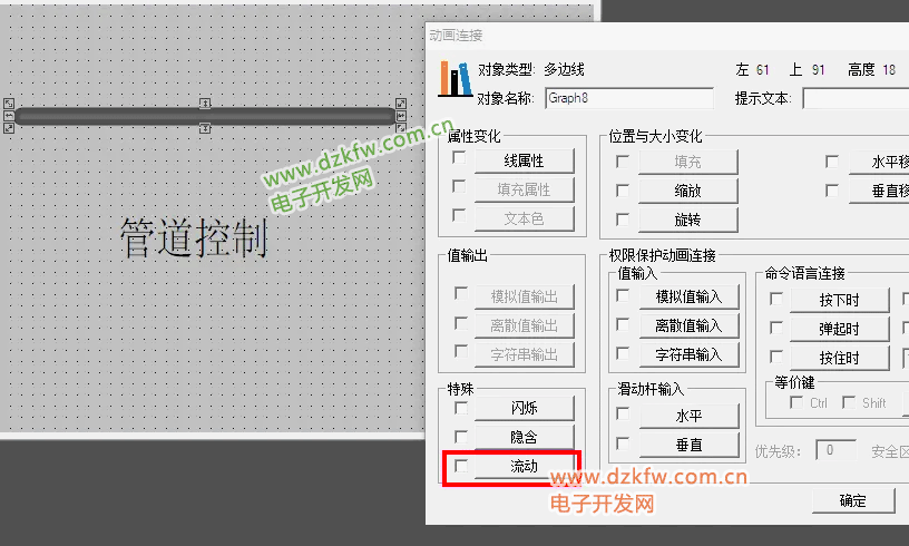 雙擊管道,打開動畫連接界面,點擊“流動按鈕”進行組態。