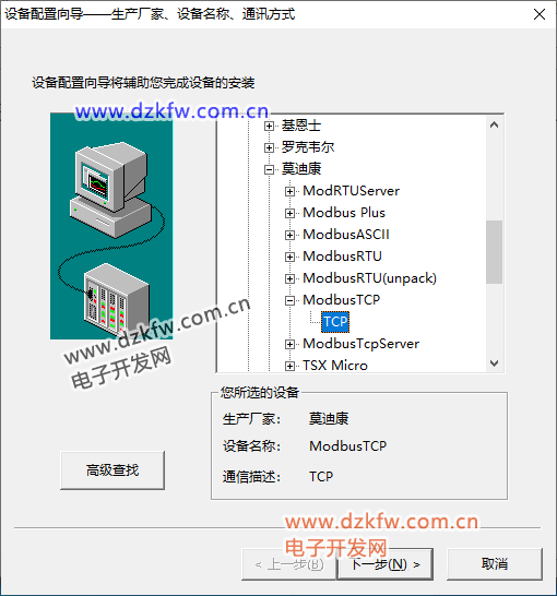 選擇莫迪康(Modicon)作為生產廠家,就是我們要通訊設備的生產廠家(大名鼎鼎的Modicon,以前也叫過歌德,中國的煉鋼廠當時用得都是這個廠家得PLC)。通訊協議選擇是ModbusTCP。這個協議是在Modbus串口通訊協議發展而來得。