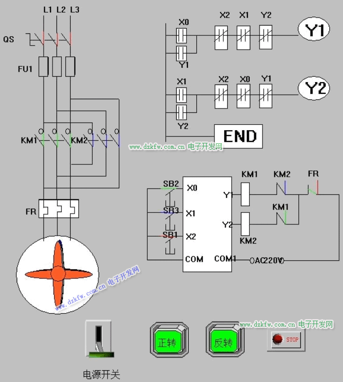 1 、畫一個風扇以表示電動機的正反轉運行。同時畫這個電動機 正反轉的控制面板?刂泼姘迳显O有總的斷路器、停止、正轉、 反轉按鈕。