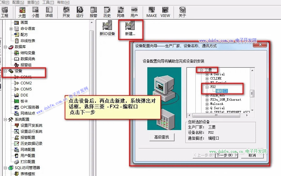 1、點擊設(shè)備-再點擊-新建 -系統(tǒng)彈出對話框,選擇PLC類型為三菱 - FX2N- 編程口