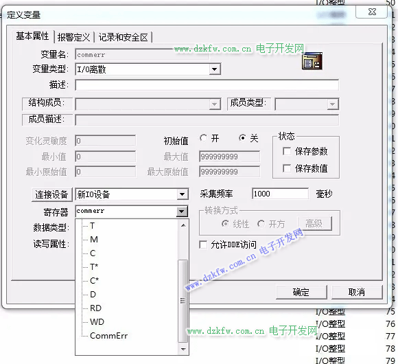 變量名隨便寫,變量類型為I/O離散型,連接的設(shè)備為上面第二步PLC指定的名稱,寄存器為commerr 點擊確定。