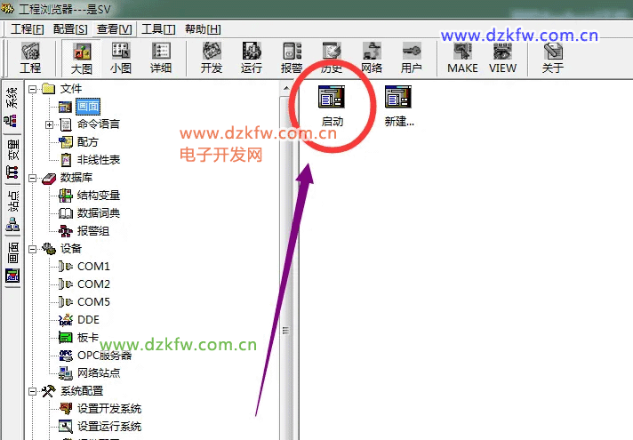 在工程瀏覽器右側(cè)用鼠標(biāo)左鍵雙擊“啟動”圖標(biāo),進(jìn)入開發(fā)系統(tǒng)對話框。