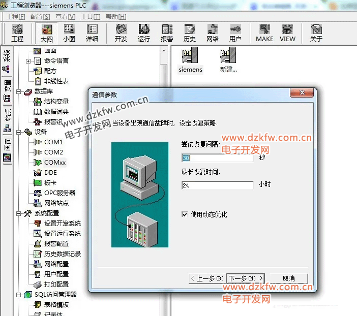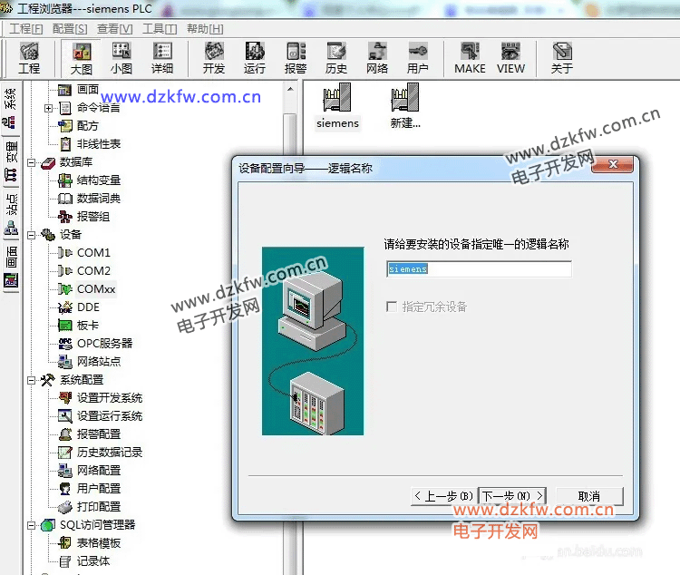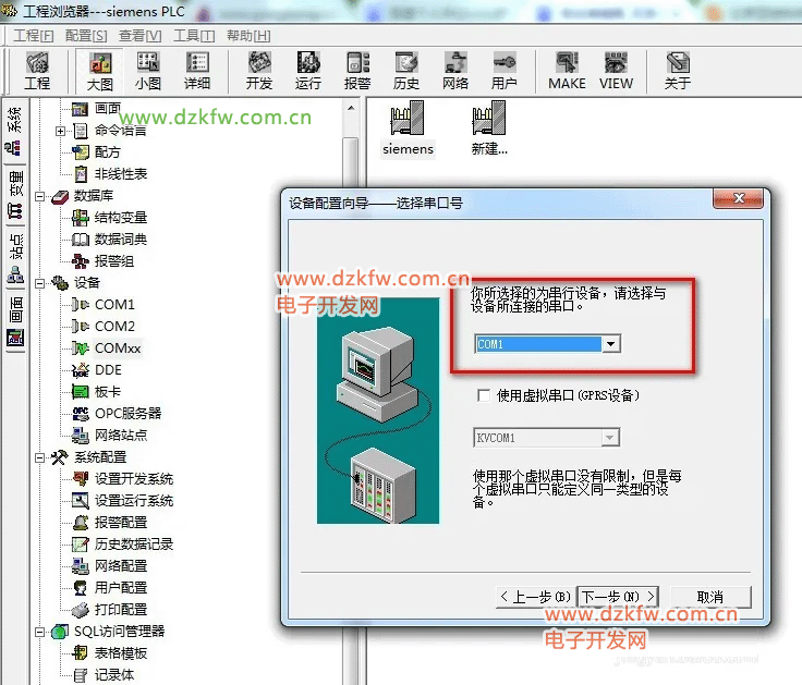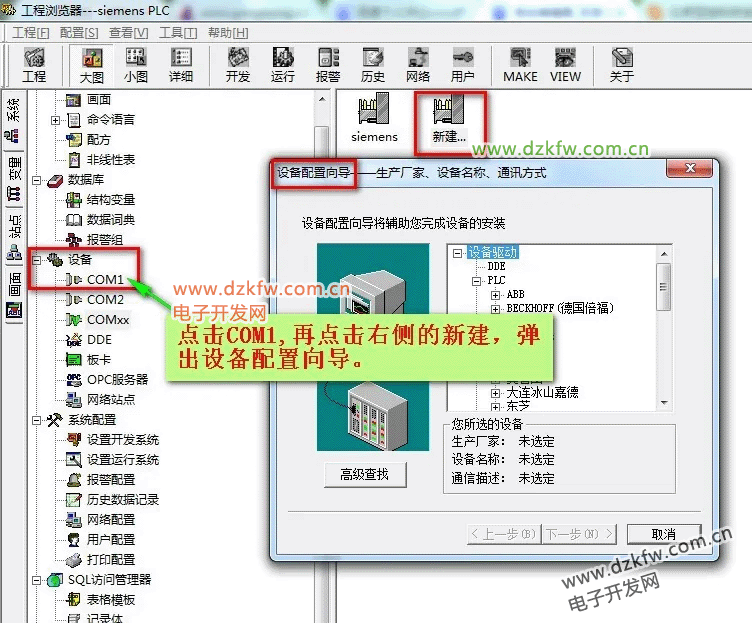 打開組態王軟件,點擊設備下的COM1,再點擊右側的新建,彈出設備配置向導。