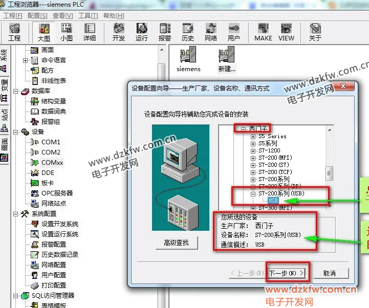 點擊向導下的 PLC - 西門子 - S7-200系列(USB)下的USB選項,選中后,可查看當前的設備情況。然后點擊下一步。