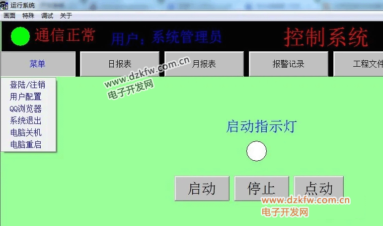 用組態王編輯一個簡單的畫面,可查通信狀態,也可以在線控制PLC動作