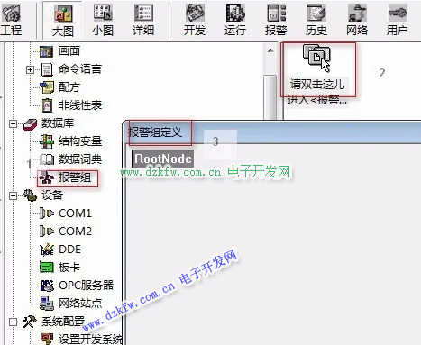 在工程瀏覽器左側選擇“數據庫”中的“報警組”,雙擊“進入報警組”,彈出“報警組定義”對話框。