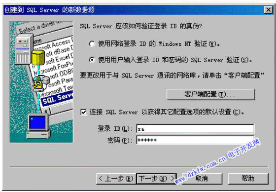 (5)選擇“使用用戶輸入登錄ID和密碼的SQL Server驗證”,“登錄ID”輸入“sa”,如有密碼則輸入密碼,點擊“下一步”: