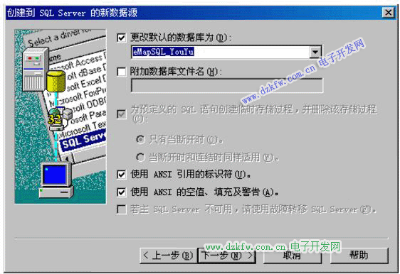 (6)將“更改默認的數據庫為”打勾,選擇需要連接的數據庫名稱,點擊“下一步”: