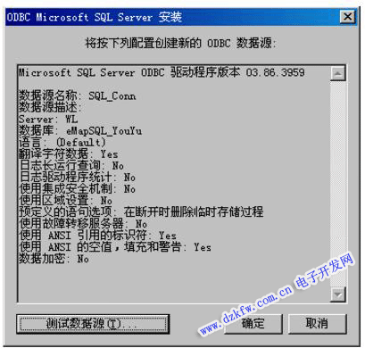 (8)點擊“測試數據源”,如果提示“測試成功”,表示配置正確,點擊“確定”,完成ODBC連接配置: