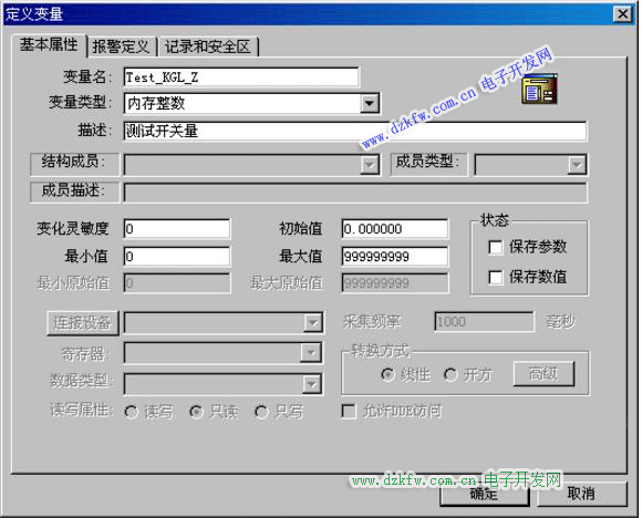 (2)雙擊“新建”,輸入變量名,變量類型,變量名為需要保存到SQL數據庫中的數值,如開關量,模擬量,字符串等,點擊“確定”: