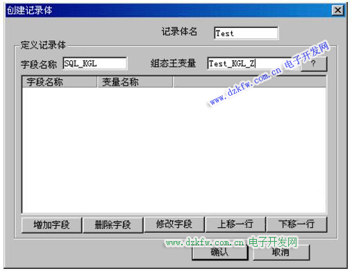 (2)雙擊“新建”,輸入“記錄體名”,“字段名稱”輸入SQL數據表中的字段名稱,“組態王變量”輸入保存數值的變量名(可點擊“?”選擇),點擊“增加字段”,可以保存該條記錄,如有其它字段需要保存,可重復錄入。全部錄入完畢后,點擊“確認”完成: