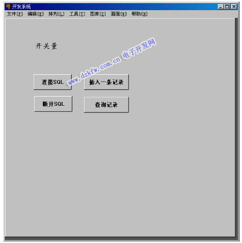 (2)新建“文本”——“開關量”,新建“按鈕”——“連接SQL”,新建“按鈕”——“插入一條記錄”,新建“按鈕”——“查詢記錄”,新建“按鈕”——“斷開SQL”: