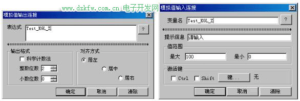 (3)雙擊“文本”——“開關量”,“值輸出”——“模擬值輸出”——選擇“Test_KGL_Z”變量,“權限保護動畫連接”——“值輸入”——“模擬值輸入”——選擇“Test_KGL_Z”變量:
