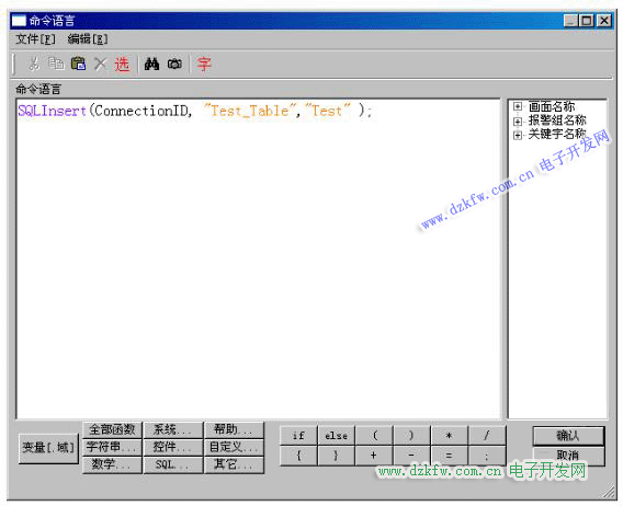 5)雙擊“按鈕”——“插入一條記錄”,“命令語言連接”——“按下時”,寫入以下語句: