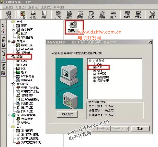 ②點擊“設備—新建”打開設備配置向導頁,點擊展開“PLC”項(見下圖2);