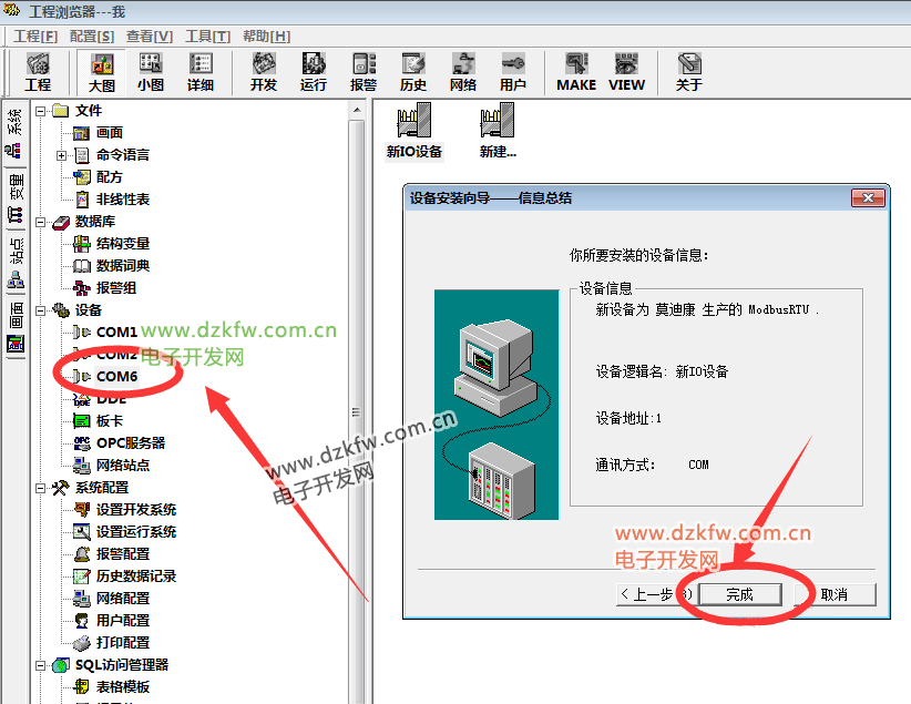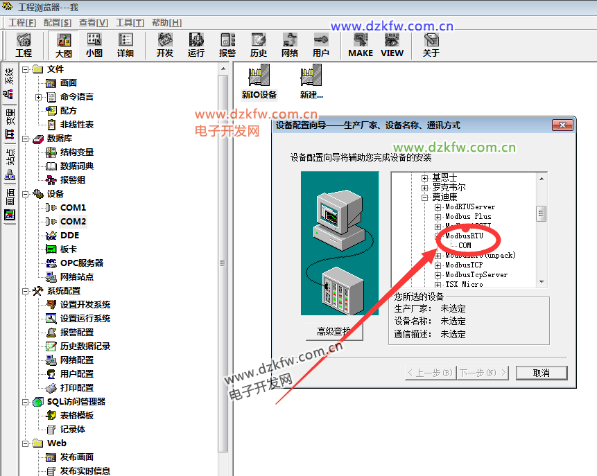 在彈出的設備配置向導中依次選擇莫迪康 /modbus RTU / com}通訊