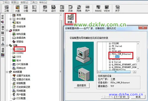 2.點擊“COM1”,選擇“新建”,在彈出的對話框的選擇“FX3u_16M_Ethernet----TCP”,點擊“下一步”。