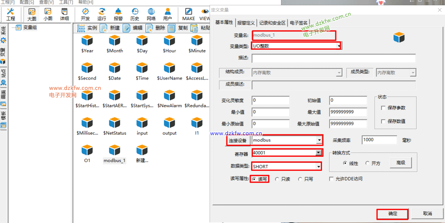 9、新建一個(gè)變量,這個(gè)新建了一個(gè)modbus_1的變量,類型為 I/O整數(shù),連接到剛才建立的設(shè)備,寄存器設(shè)置為要讀取或?qū)懭氲牡刂,類型為SHORT