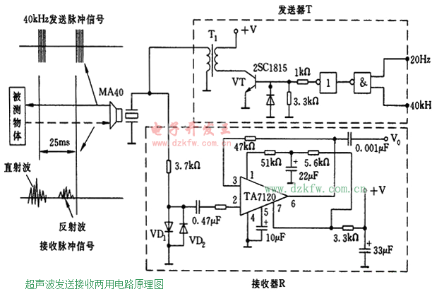 下圖是超聲波發(fā)送接收兩用電路,用一個(gè)超聲波傳感器發(fā)送信號(hào)的同時(shí)還可以接收信號(hào)。使用TA7120進(jìn)行信號(hào)放大。