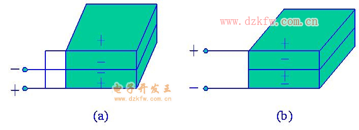 壓電傳感器一般由兩片或多片壓電晶體粘合而成,由于壓電晶片有電荷極性,因此接法上分成并聯和串聯兩種(如圖3所示)。