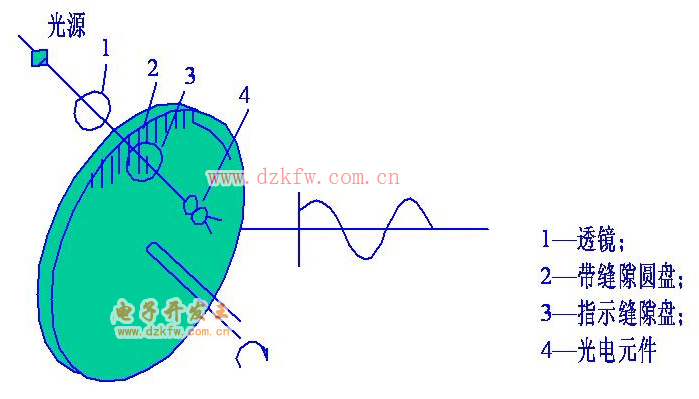 光電式轉速傳感器是一種角位移傳感器,由裝在被測軸(或與被測軸相連接的輸入軸)上的帶縫隙圓盤、光源、光電器件和指示縫隙盤組成,如圖所示。