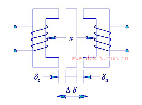 圖2為差動型磁阻式傳感器,它由兩個相同的線圈、鐵心及活動銜鐵組成。
