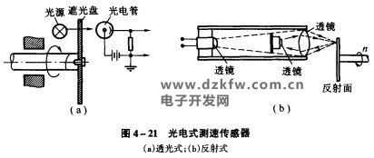 光電式測速傳感器的工作原理是基于光電變換原理,將被測軸的轉速轉換為電脈沖信號。其結構形式可分為透光式和反射式兩種,如圖4-21所示。
