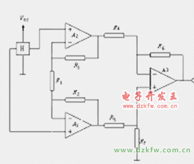 霍爾元件的輸出電壓一般較小,需要用放大電路放大其輸出電壓。為了獲得較好的放大效果,需采用差分放大電路,如圖3所示。使用一個運算放大器時,霍爾元件的輸出電阻可能會大于運算放大器的輸入電阻,從而產生誤差,而采用圖4所示的電路,則不存在這個問題。