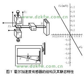 圖7示出霍爾加速度感測器的結構原理和靜態(tài)特性曲線。在盒體的O點上固定均質彈簧片S,片S的中部U處裝一慣性塊M,片S的末端b處固定測量位移的霍爾元件H,H的上下方裝上一對永磁體,它們同極性相對安裝。盒體固定在被測對象上,當它們與被測對象一起作垂直向上的加速運動時,慣性塊在慣性力的作用下使霍爾元件H產生一個相對盒體的位移,產生霍爾電壓VH的變化。可從VH與加速度的關系曲線上求得加速度。