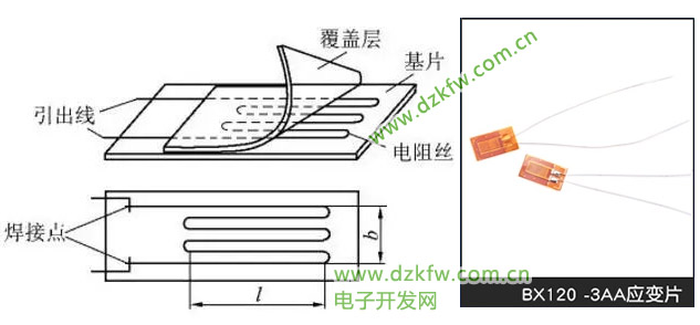 合金電阻絲以曲折性(柵形)粘接劑粘貼在絕緣基片上,兩端通過引線出,絲柵上面再粘貼一層絕緣保護膜。把應變片貼于被測變形物體上,敏感柵隨被測物體表面的變形而使電阻值改變,只要測出電阻的變化就可得知變形量的大小。電阻應變片主要恩威金屬應變片和半導體應變片,常見的金屬應變片有絲式,箔式和薄膜式三種(如圖),半導體應變片是在硅上利用擴散技術形成電阻。