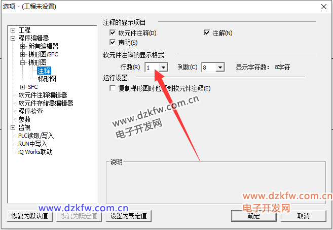 視圖—軟元件注釋顯示格式—工程編輯器----梯形圖—注釋—軟元件注釋的顯示格式—行數—(自己看著改,最好是1)
