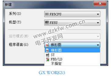 2、新建FX5U工程,通過下拉列表可發現GX WORKS3取消了簡單工程和結構化工程的區分,并且SFC編程也沒有在菜單中出現。