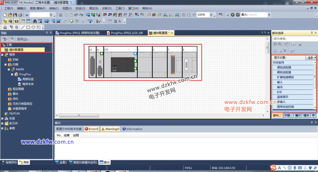 3、FX5U是結構化的編程設計,進入編程軟件在導航欄中的工程菜單下,在模塊配置圖中,用戶可以根據需要選擇輸入輸出硬件或者是相關的功能模塊進行配置。