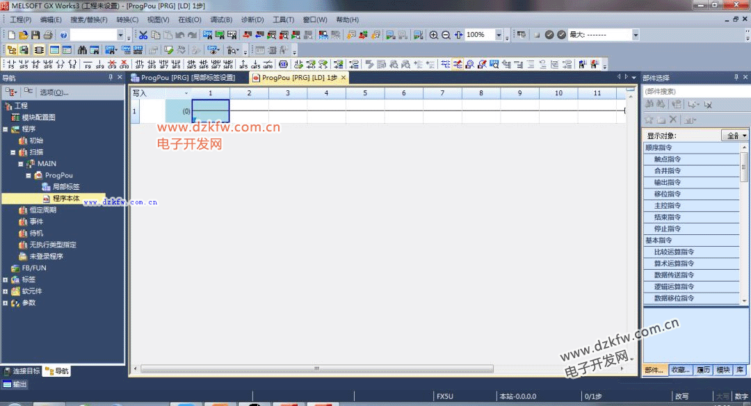 4、GX WORKS3的界面設計:其布局基本沿用了GX WORKS2的設計,添加了部件選擇窗口選擇PLC指令以及用戶所登錄的FB/FUN等,用戶還可以對幾天前使用過的指令進行查看。