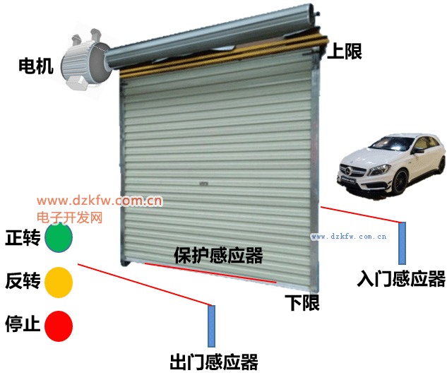 2.汽車離開入門感應器時,卷閘門自動下降到下限;