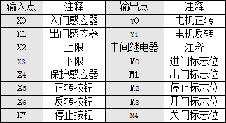 除了輸入輸出點,由于程序分為進入和出去,需要2個標志位,一個是入門的M點,一個是出門的M點;實現停止功能,需要一個停止標志位;另外,無論入還是出,都需要開門和關門,這里需要開門標志位和關門標志位,因為除了自動控制,后面還需要做手動控制的動在(對應這里寫這么多標志位不明白可以繼續問下看,從程序的寫法去理解)。