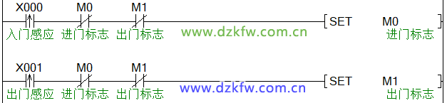 2)進門時離開出門感應器(M0 X1下降沿)或者出門時離開入門感應器(M1 X0下降沿),這兩種情況就可以進入關門動作。