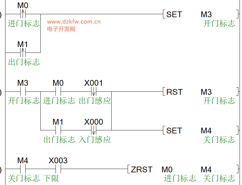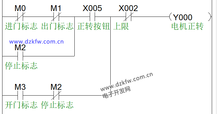 1)當M0或者M1觸發時(進或者出開始時),置位M3開門標志,后面程序會用這個M點去控制電機動作;