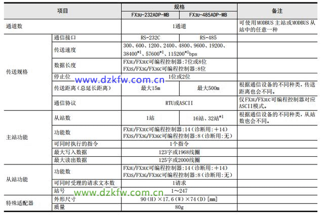MODBUS通信根據與可編程控制器連接的特殊適配器(FX3U-232ADP-MB或FX3U-485ADP-MB)的下列規格執行
