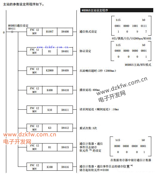 4.因此推薦只使用1次“LD M8411”。4. MODBUS通信設定的語法請全部用MOV指令和常數(K或H)設定MODBUS通信參數。如果在通信設定中使用非常數或間接指定,則MODBUS通信參數會變得無效,MODBUS通信也會無效。