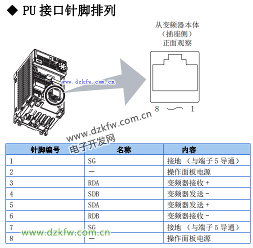 二、硬件接線說明打開變頻器的蓋板,你會看到電路板上有一個看似是網口的接口,實際上它是一個485通訊接口。從右到左分別標有1至8號針腳,而我們需要連接的是3、4、5、6號針腳。