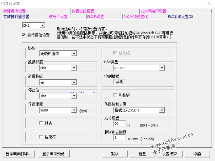 對應3U PLC的485 BD板也需要設置通訊參數,點擊PLC參數進入設置界面。選擇PLC系統設置2.勾選通道1通信設置,協議為無順序協議。數據長度,奇偶校驗,停止位,波特率都與變頻器參數設置一致。