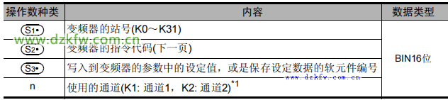 例如頻率控制:將D0的設定值寫入到站號為1的變頻器的頻率地址中。(參考下圖)