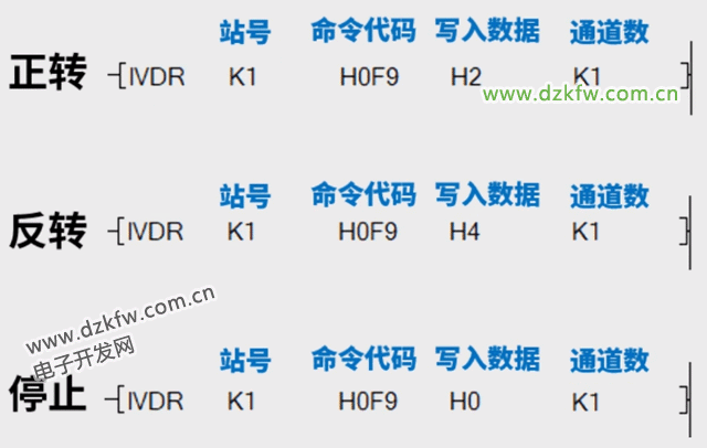 四、指令說明1、IVDR指令:把數據寫入到變頻器對應的通信地址。